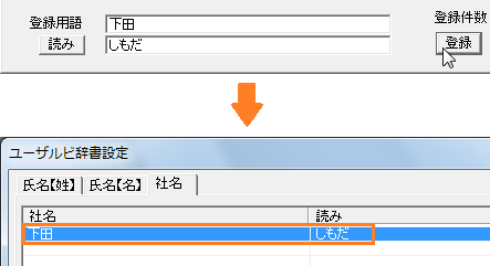 ③「ユーザールビ辞書設定」画面で登録する項目のタブ(「氏名【姓】」/「氏名【名】」/「社名」)をクリックします。